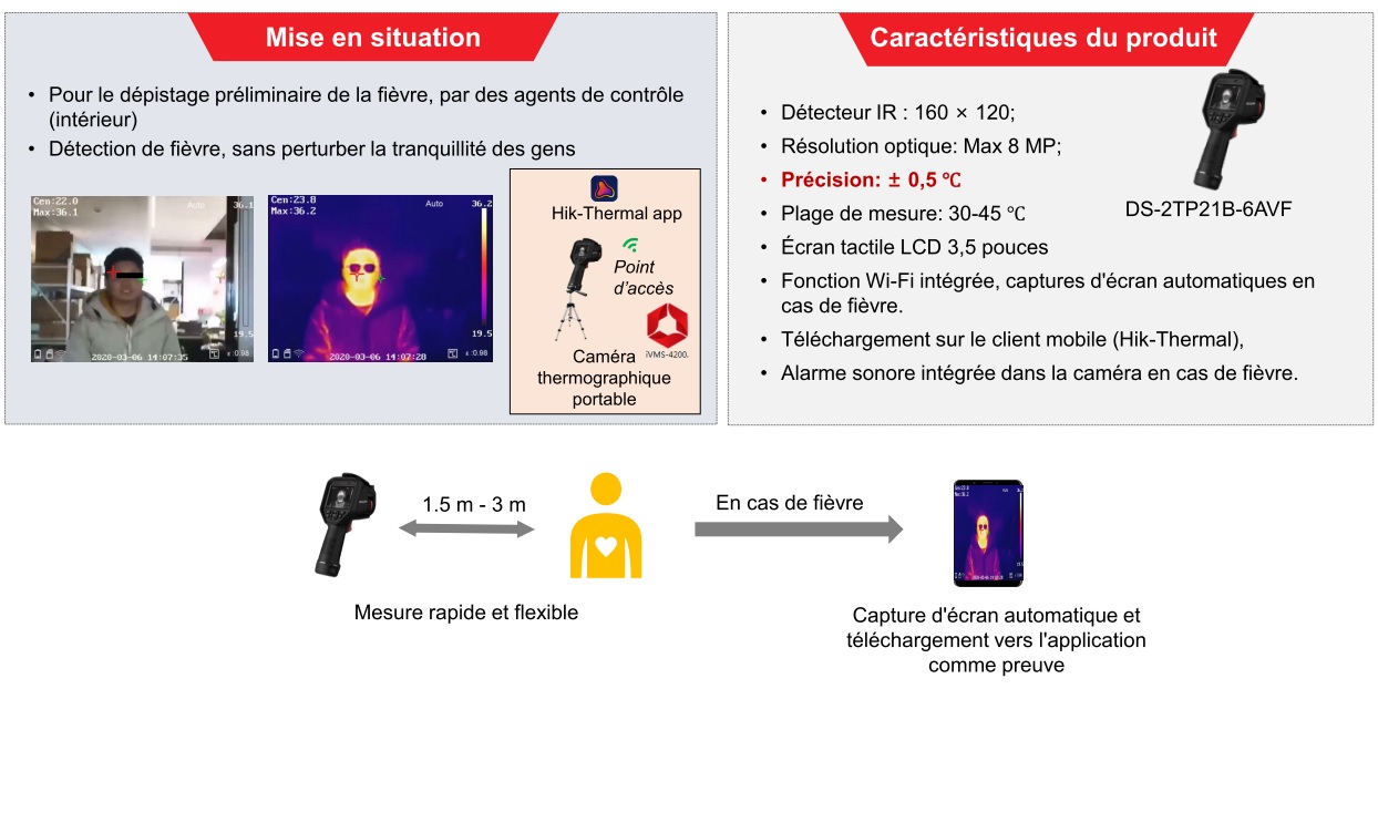 L'apparition de maladies comme le H1N1, SRAS ou Covid oblige les pouvoirs publics et entreprises à trouver des méthodes plus fiables pour détecter des personnes malades rapidement. Il n'est pas toujours facile de détecter les personnes ayant de la fièvre dans les endroits à fort trafic de personnes. Il faut donc une méthode rapide et efficace permettant de tester si des personnes ont de la fièvre. La caméra thermique infra rouge avec détection de fièvre est un outil répondant à ce problème. Il faut en effet moins de 1 seconde à la caméra pour détecter la fièvre. Elle est une aide précieuse pour détecter les personnes malades et limiter la contagion. Grâce à la reconnaissance faciale et la prise de température, vous pouvez autoriser ou interdire l’ouverture des barrières en fonction des individus et/ou de leur température corporelle.